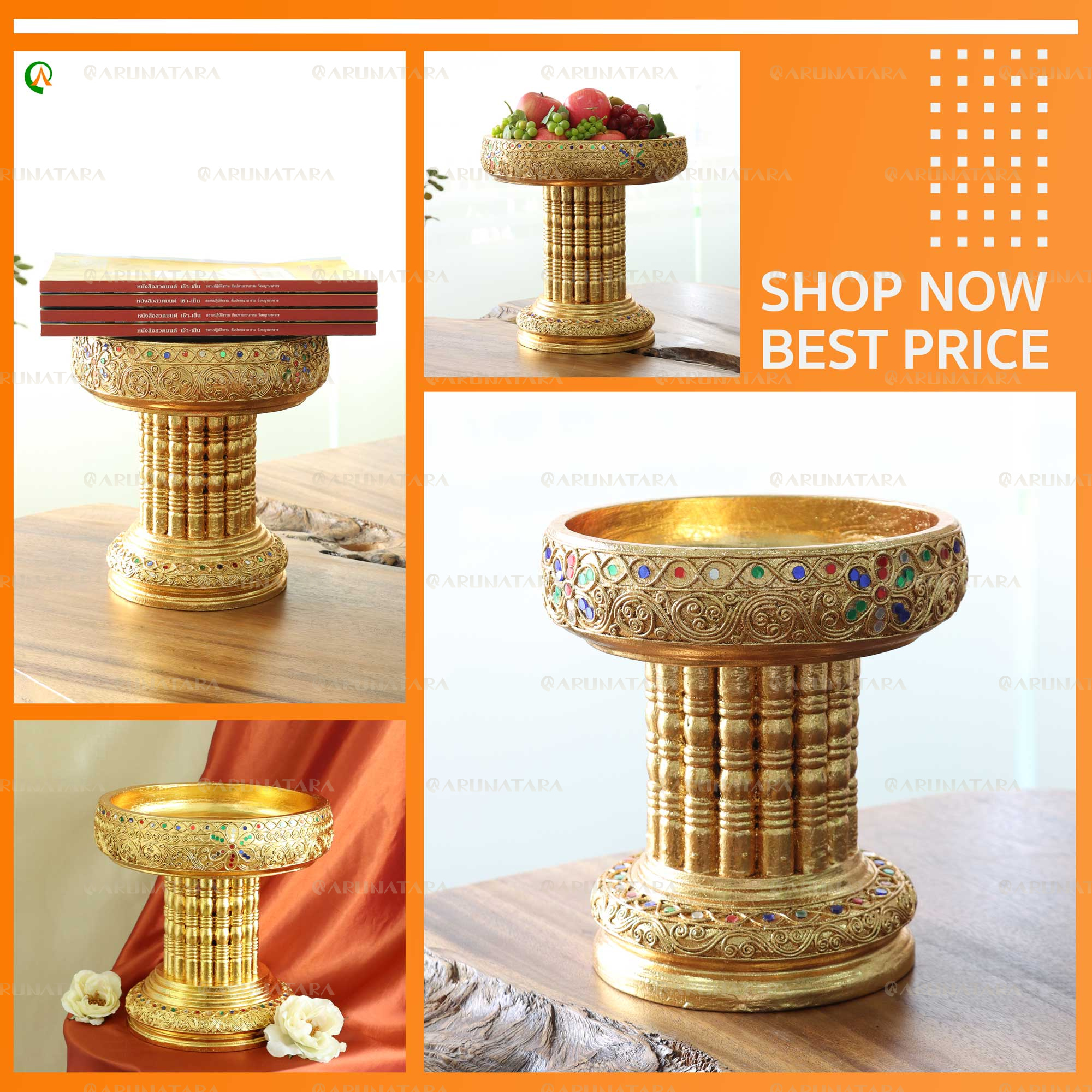 ∙ ขันโตกขาทึบสูงปิดทองด้วยมือพร้อมประดับกระจกสีอย่างประณีต